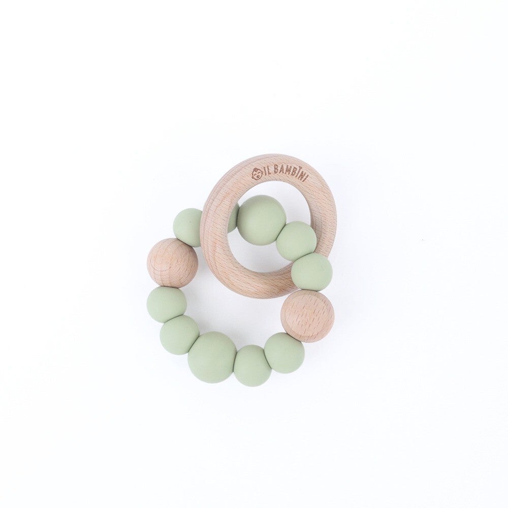 Deze stijlvolle bijtring is gemaakt van een combinatie van natuurlijk beukenhout en zachte siliconen kralen in een rustgevende groene kleur.